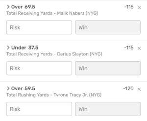 Darius Slayton Under 37.5 Receiving Yards: This line is simply too high. Darius is the 3rd receiving option and relies on the big play to hit his receiving total. I do not see him hitting this on limited targets this week.Â